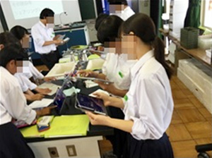 本実践において対象としたのは,平成28年度に本校へ入学してきた第一学年167名の生徒である。実践開始前に実施した事前の質問紙調査では,小学校段階において「理科の授業では,よく考えたり,意見を出したりする」,「理科の授業では,自分の考えた意見を表現することがある」といった活動経験が乏しい実態が見えてきた。そこで毎時間の学習課題を,例えば「校内の植物を観察して撮影し,特徴や周りのようすを伝えよう」というように,表現することを意識したものに設定した。加えて理科室に一人一台のiPadを自由に使用できる学びのツールとして準備し,常に授業のゴールとしての表現活動を考えながら学びを進めることができるようにした。