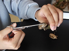 授業の前に,「ぬけがら」を水に5分~10分浸すと(前日から浸しておいてもかまいません)柔らかくなり,足や腹部を「節」で曲げたり伸ばしたりできる様子を再現できます。また,気門の白さが際立ち,気門の観察がしやすくなります。クマゼミやエゾゼミの「ぬけがら」は図5の作業が必要ですが,アブラゼミはそのままで気門を観察できます(図6)。