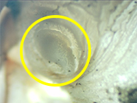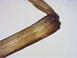 「ぬけがら」の断面(図7)を観察すると,白い筋(気管)が「気門」からつながって,体中に張り巡らされていたことがわかります。「ぬけがら」に残された白い筋は幼虫時代の気管です。また,生徒が興味を持った部分(図8)を撮影して発表しあったり,トンボ(写真はクロスジギンヤンマ)の「ぬけがら」(図10~13)と比較したりすると,言語活動が充実します。「セミのぬけがら」の前足(腿節)内部の「腱」などを事前に撮影しておき,TV画面で拡大して見せると,「カニ」と似ている部分(図9,12)があることなどに気づき, 外骨格についての理解がしやすくなります。