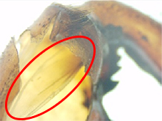 時間があれば,熱湯で殺菌したり泥を洗浄したりすると衛生的です。また,「ぬけがら」の羽(翅芽(しが))を外すと,胸部の気門を観察しやすくなります(図2,図4)。胸部に羽が4枚ついていることも確認でき,一石二鳥です。カットする部分にマーク(図3)をしておくと作業がしやすいです。
