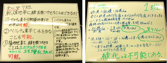 図2に話し合い活動の際に使用したホワイトボードでの説明例を示す。今回の授業では,「できる」と考えている生徒が7割,「できない」と考える生徒が3割であった。生徒が調べた内容をみると,少ない水でも育つ植物について詳しく調べている班,ペルティエ素子を活用する際に,太陽光発電システムを使いエネルギーを循環させようと考える班,また集めた水を貯蔵しようと考える班があるなど,多種多様な意見があった。他の班の説明を聞き自分たちの考えとの相違に気づき,認め合う場面もあった。