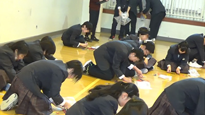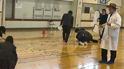◎体育館でえさ(ストローをきったもの)を集める虫役の生徒たち