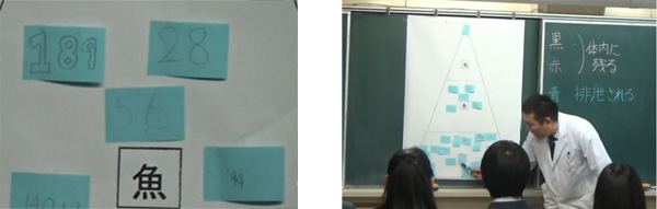 ○結論のようなことを生物濃縮ということを理解する。 ○体内に残る物質にはどのようなものがあるか考える。 ○体内に残る有害な物質の数を赤の付箋に書き,黒板に貼る。 ○有害な物質も生物濃縮により,数が増えていることを確認する。 【課題解決の姿の深化】 |