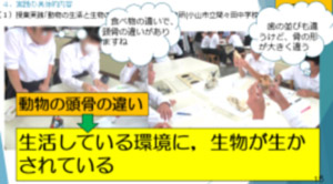 動物の分野において,草食動物と肉食動物の違いを確認した。その際,頭骨のみを生徒に配布し,頭骨の違いから食べ物の違いに気付く授業をした。
