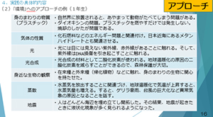 (1)「自然環境の保全と科学技術の利用」に向け,理科の系統性に基づき,3年間を見通しながら,各単元から「環境」にアプローチすることによって,より総合的な見方や考え方で日常的に自然環境を捉えられるようになるだろう。