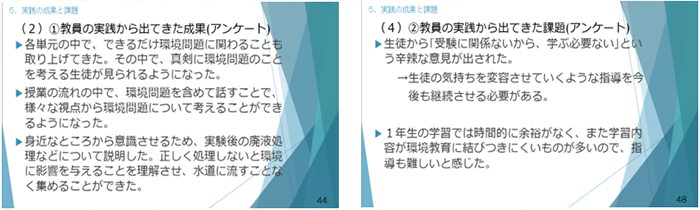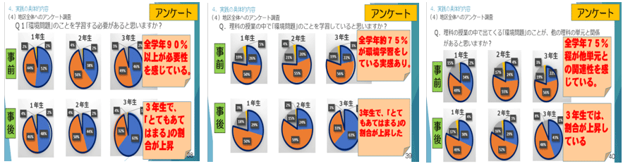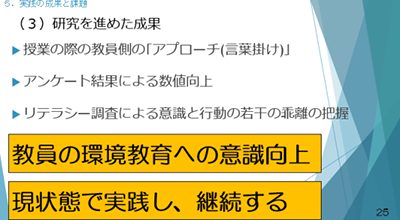 授業の際に,ほんの5分でも環境に関して話題にすると,生徒はそれを学習内容に関連させて聞き取り,即効性はないものの,後々の環境教育に繋がった。そのことがアンケート調査の結果の数値上昇に寄与していると考えられた。