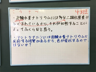 ○炭酸水素ナトリウムが関係していたことを確認し,なぜ炭酸水素ナトリウム入りだと膨らむのか考える。 ○観察したことや予想したことを交流する。 |
