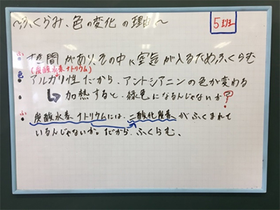 ・発表内容を整理する。 ・アントシアニンによる色の変化を確認する。 |