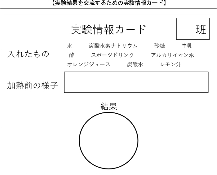 ⑤加熱後の様子を観察したあと,実験情報カードとともに前の机に並べる。