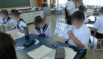 理科室で「呼吸」の実験を選択した生徒と「光合成」の実験を選択した生徒に分かれ,その中で自由に話し合いを行い,実験内容が類似している4人以下のグループを構成するよう指示した。生徒は自分の書いたレポート用紙を片手に話しながらグループを組み,それぞれまとまって席に着いた。