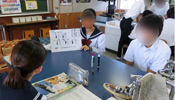 他のグループの説明を聞いて,自分たちの実験に足りなかった要素,活かせそうな工夫について話し合い,実験を改良する。(再構成の場)