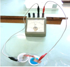 硫酸銅水溶液(1mol/L)10ml,硫酸亜鉛水溶液(0.5mol/L)10mlをそれぞれ容量15mlのプラスチック容器(プチカップ15ml:DAISO)に入れ,硫酸銅水溶液に電極として銅板を入れ,硫酸亜鉛水溶液に電極として亜鉛板を入れ,2つの電極を導線で電圧計とつなぐ。約12cmのシリコンエアーチューブ(内径 5mm 外径 7mm)に式根島の海岸の白い砂を楊枝で押し込んでからチューブの両端を丸めた脱脂綿を入れて塞ぎ,中に硝酸カリウム水溶液(0.5mol/L)を満たすように入れて塩橋を作る。これを針金でU字形に固定し,一方を硫酸銅の入ったプラスチック容器,もう一方を硫酸亜鉛の入ったプラスチック容器に入れて回路を作る(図3)。