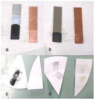 〇ダニエル電池は両極とも気体が発生せず,+極(銅板)では電極をろ紙でこすると茶色い物質が付着したが,-極(亜鉛板)では電極をろ紙でこすると黒い物質が付着した(図6b,d)。このことから,+極では銅が付着し,-極では硫酸亜鉛に溶けてくずれた亜鉛が黒い物質として現れたと考えられた。