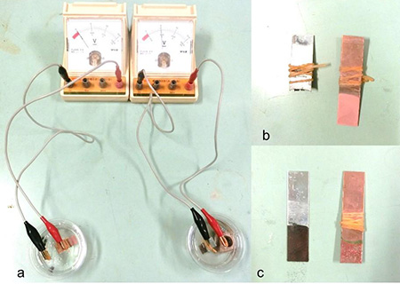 a.ダニエル電池(右)とボルタ電池(左)の様子