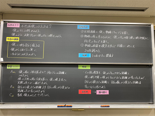 本実験教具を用いた実践は,「令和4年度 滋賀県中学校教育研究会理科部会 研究発表協議会」の中で,授業公開した。本実践は,物体と鏡に映った像の位置の関係性を見いだせる点や,ハーフミラーがホームセンターで容易に入手できる点などから,多くの先生方に好意的なご意見をいただけた。
