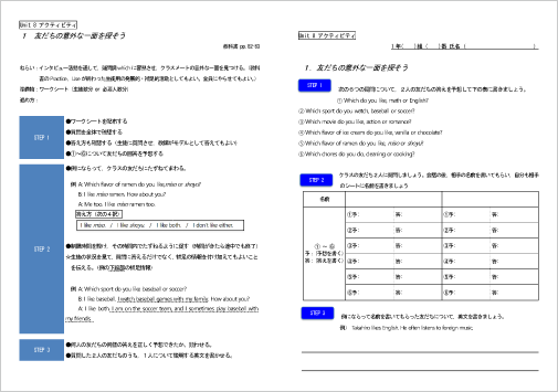 各ページの指導案やプリント例。 英語での授業展開例も掲載。