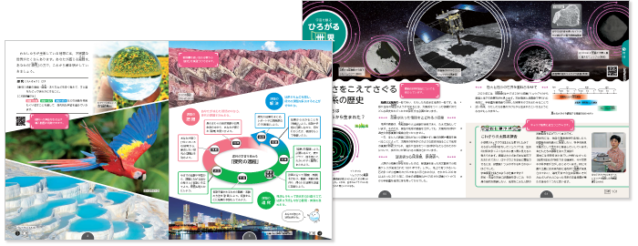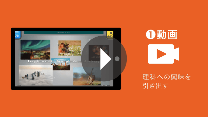 未来へひろがるサイエンスでは,理科に対する興味関心を高め,安全配慮にも役立つ「動画」「アニメーション」「スライドショー」,授業の復習に役立つ「フラッシュカード」など,多様な約390コンテンツ(QRコード約310箇所)をすぐにご利用できます。授業の補助,家庭学習のサポートなど様々な場面でお使いいただけます。