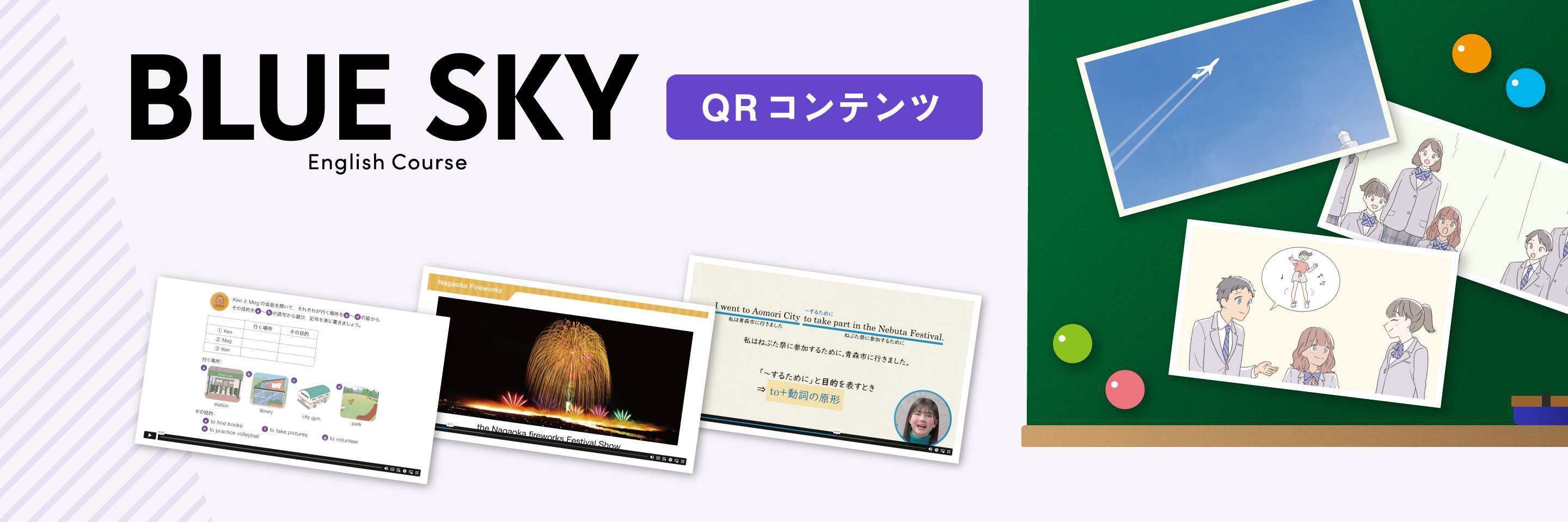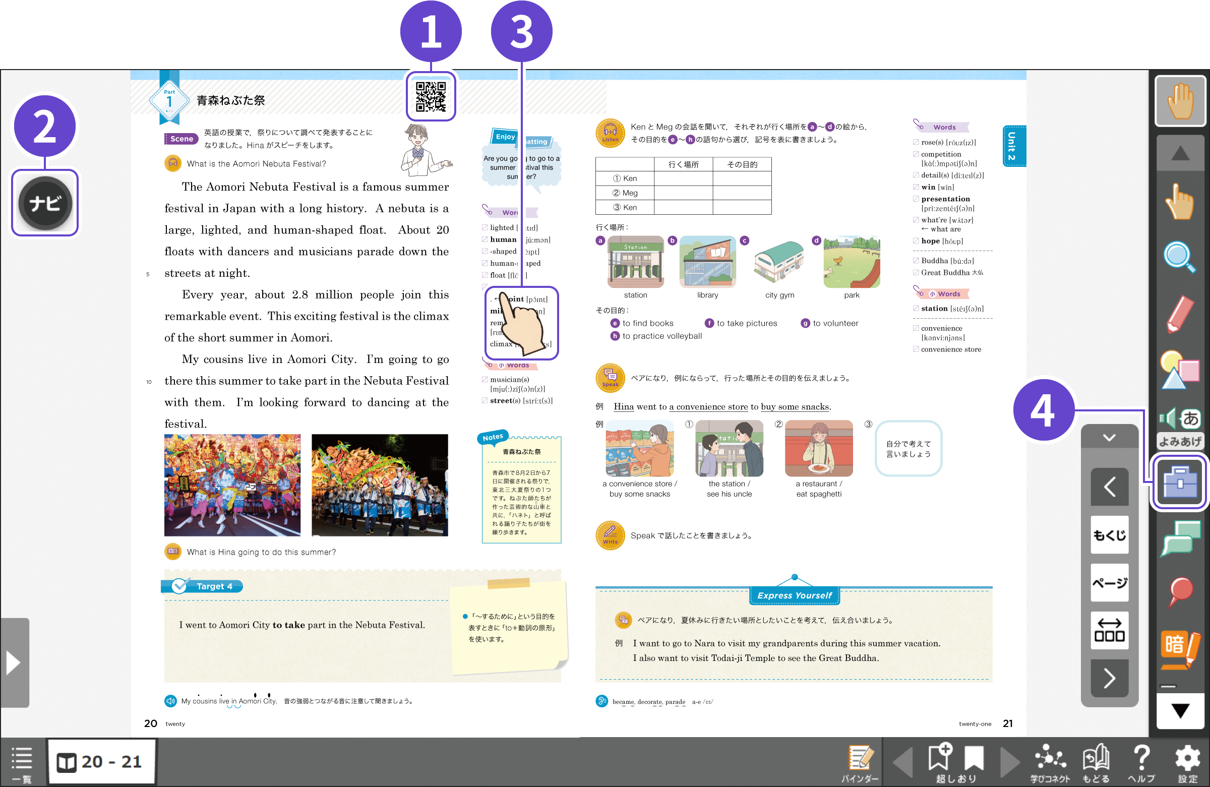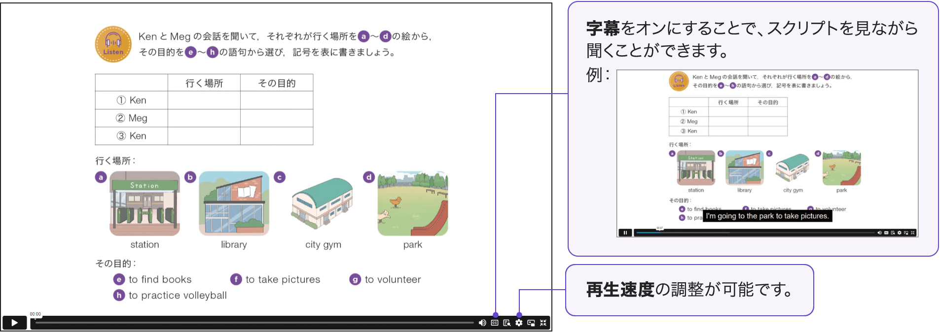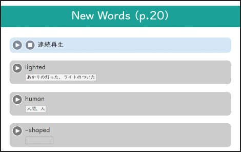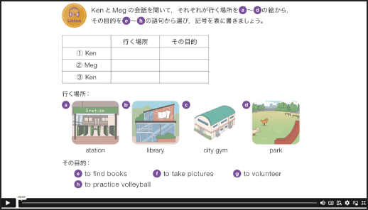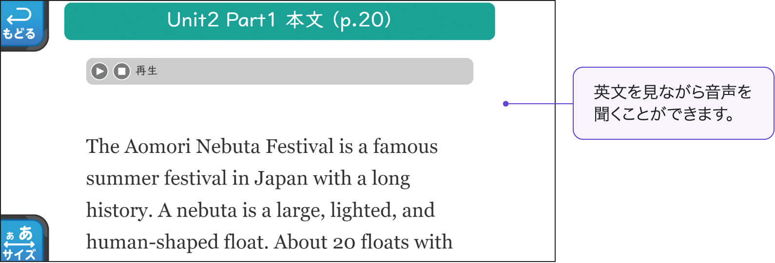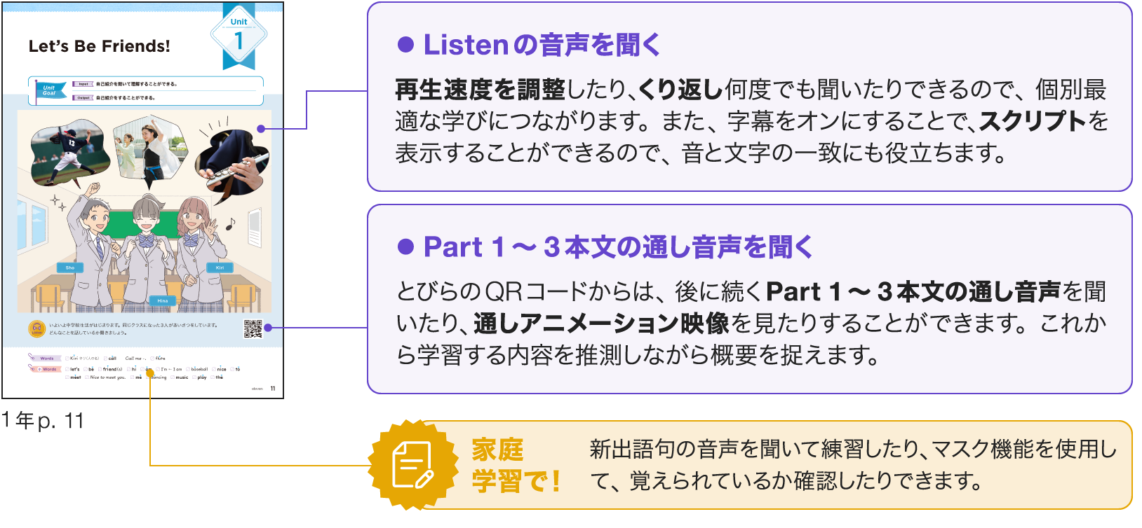 Unit、Let’s Talk、Let’s Write、Let’s Read、Project など紙面に掲載されている英文の音声を聞くことができます。