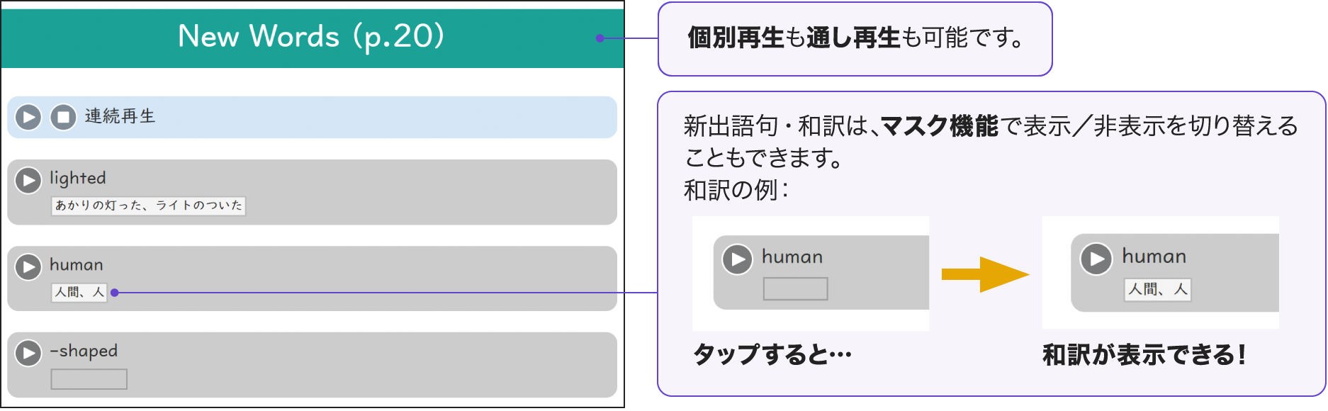 読み上げ機能を使用して、紙面の語句などをタップするとネイティブの発音を確認することができます。