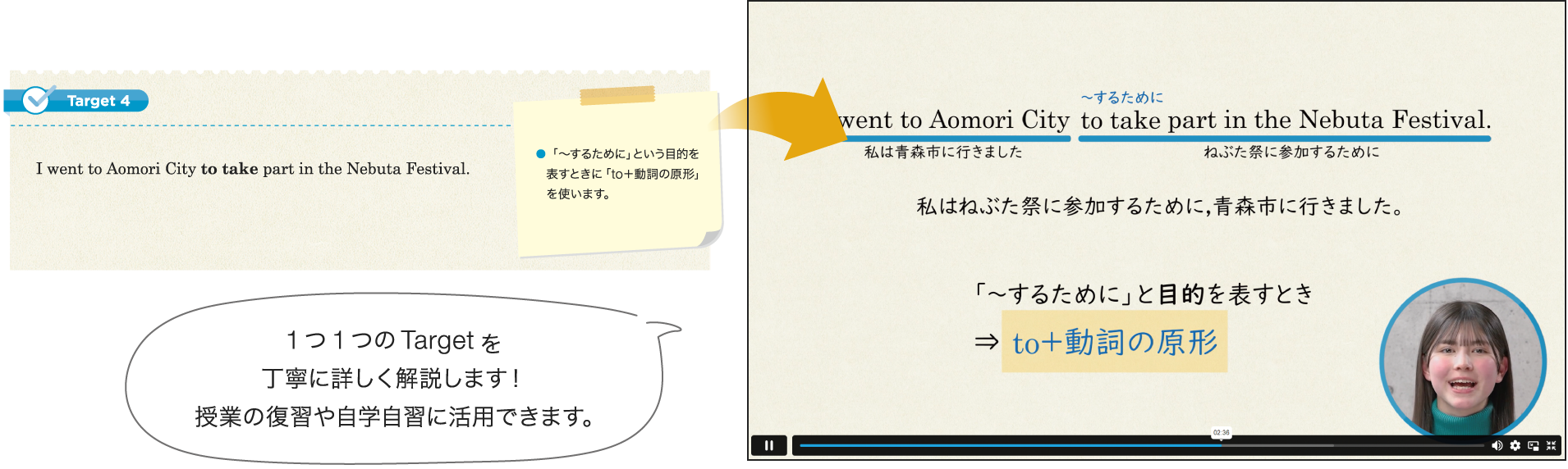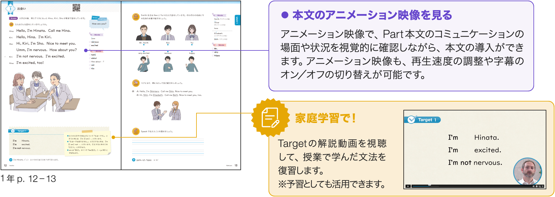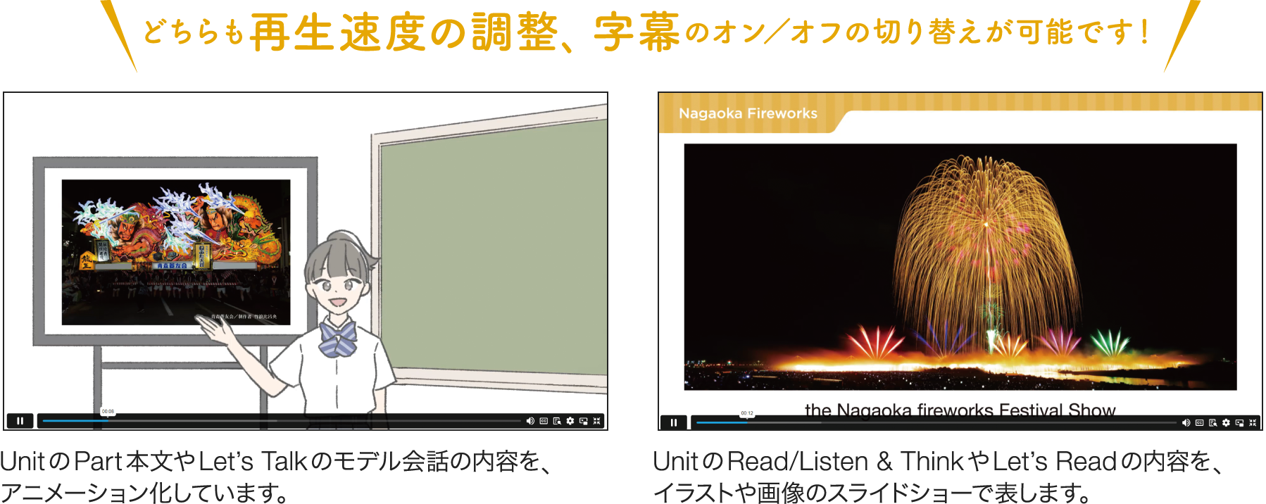 本文を、アニメーション映像やスライドショー映像を見ながら聞くことができます。本文の目的・場面・状況をより意識することができます。