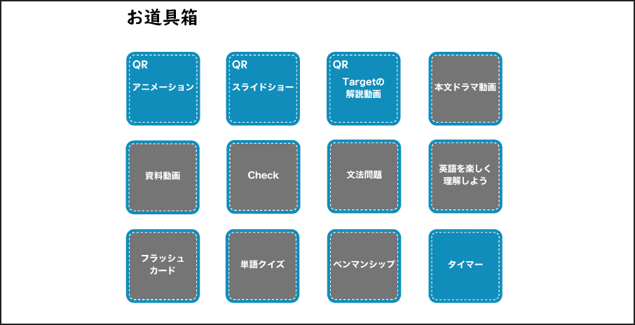 教科書の随所にあるQRコンテンツ等を整理し、「お道具箱」にまとめました。タイマーなどの便利なツールも、ここから使用できます。