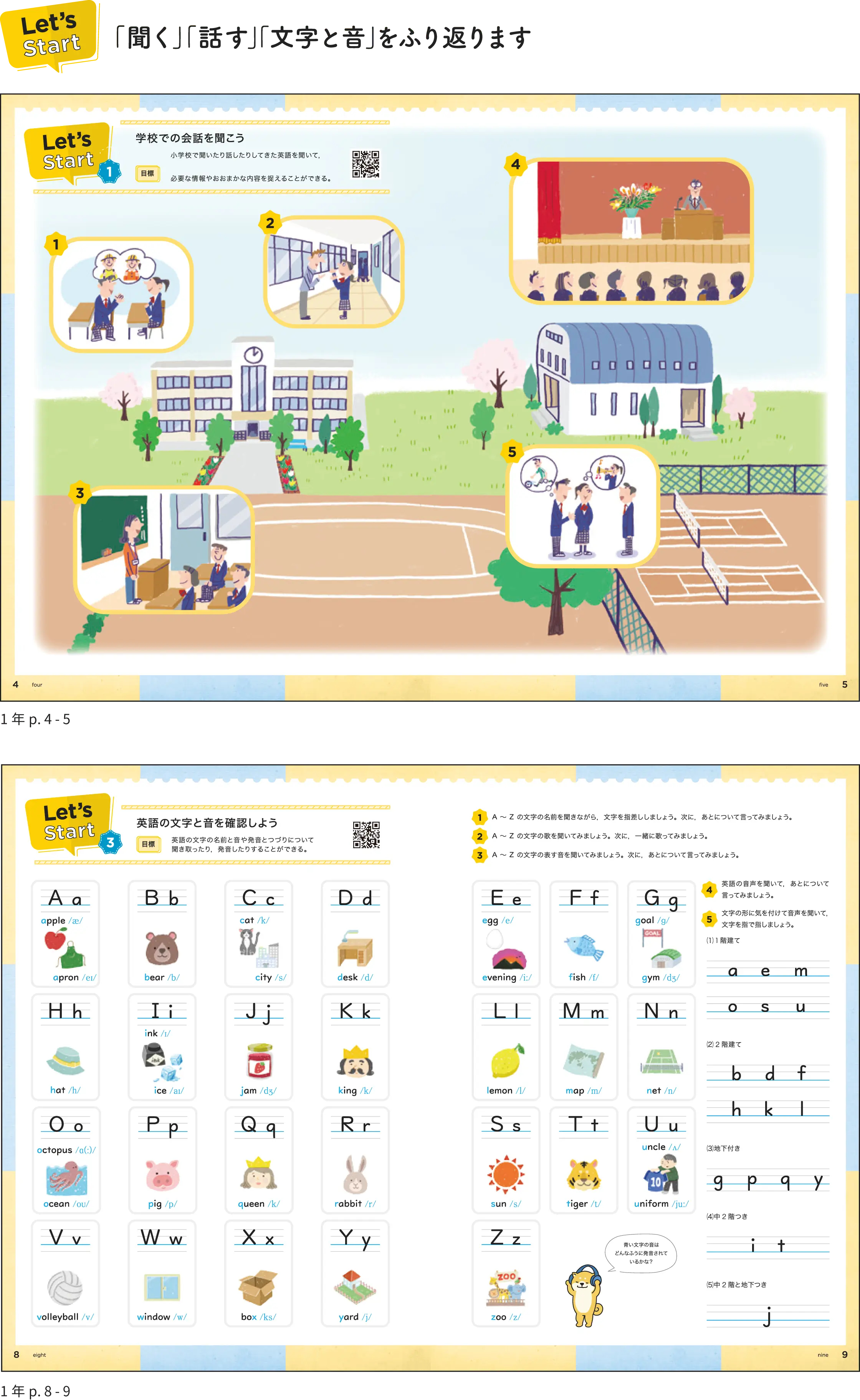 | Let’s Start 3 | アルファベットの名前と音、発音とつづりについて聞いたり、発音したりする | 3ページ |