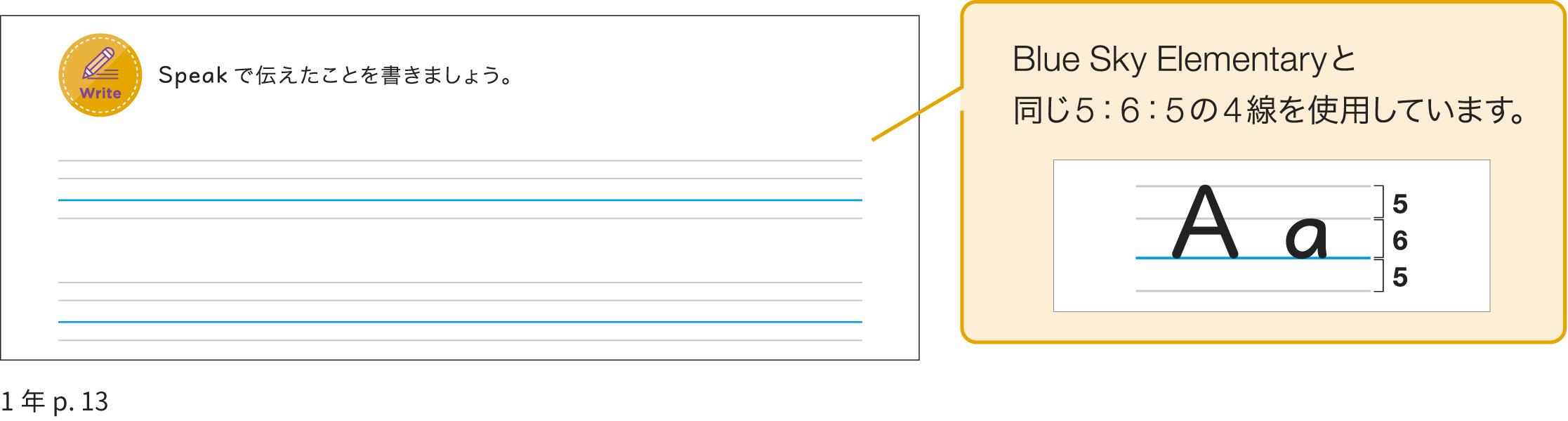学習段階に配慮し、1年Unit 1 ~ Unit 3のPartのWriteには4線を掲載しています。正確に書くことをサポートし、徐々に書くことにも慣れていくことができるように工夫しています。