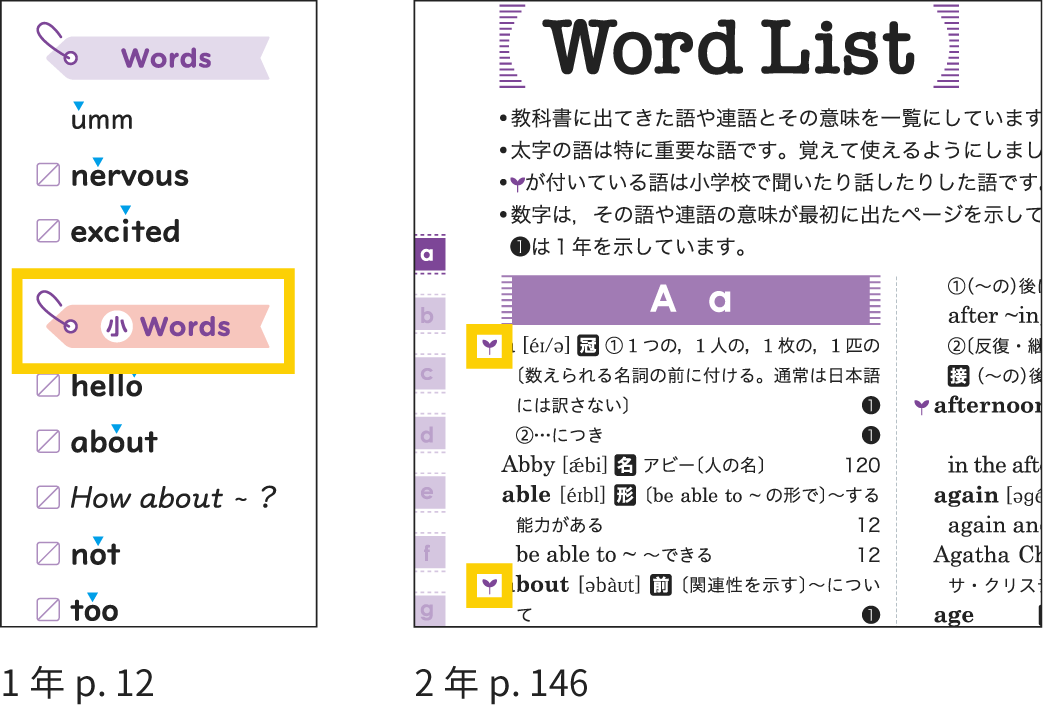 小学校で「聞く」「話す」で慣れ親しんだ語彙を小学校既習語彙とし、マークをつけて中学校での新出語句と区別して 示しています。