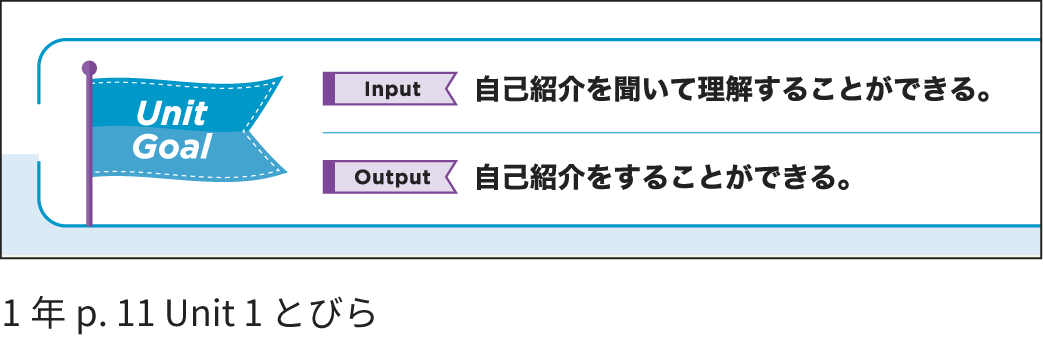 小学校で「聞く」「話す」を中心に英語を学んできたことを踏まえて、1年Unit 1 ~ Unit 5 「話すこと」を中心に設定しています。Unit 6 以降から学習段階に配慮して、「読むこと」「書くこと」の目標を設定しています。