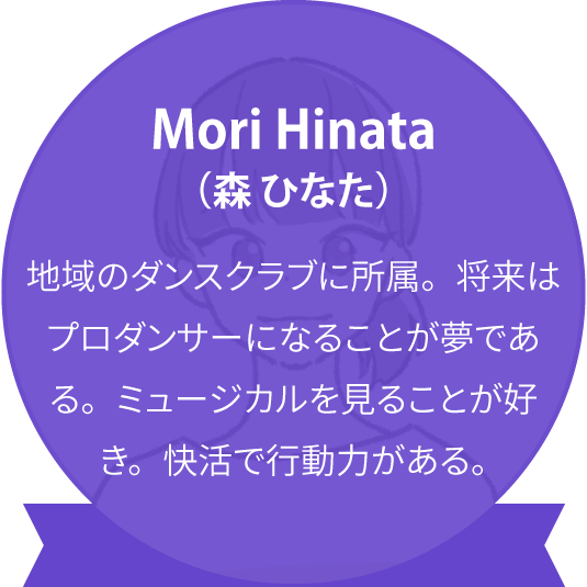 地域のダンスクラブに所属。将来はプロダンサーになることが夢である。ミュージカルを見ることが好き。快活で行動力がある。