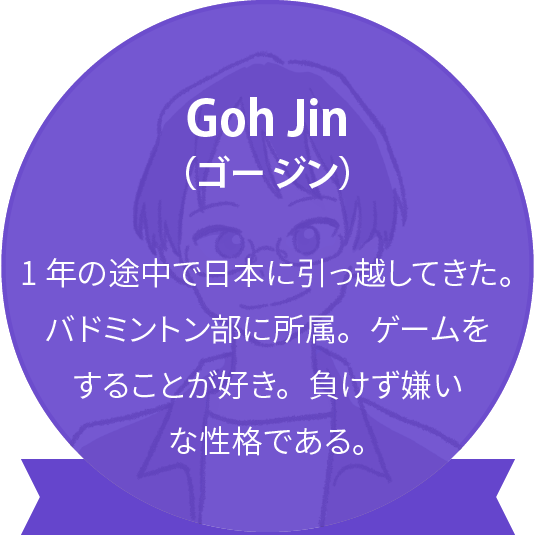 1年の途中で日本に引っ越してきた。バドミントン部に所属。ゲームをすることが好き。負けず嫌いな性格である。