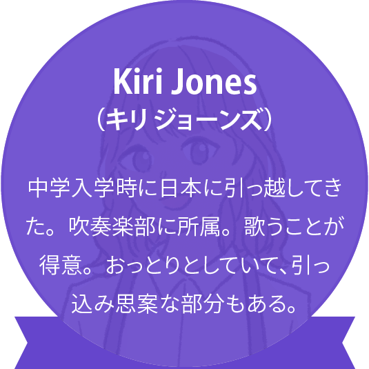 中学入学時に日本に引っ越してきた。吹奏楽部に所属。歌うことが得意。おっとりとしていて、引っ込み思案な部分もある。