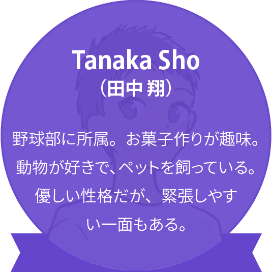 野球部に所属。お菓子作りが趣味。動物が好きで、ペットを飼っている。優しい性格だが、緊張しやすい一面もある。