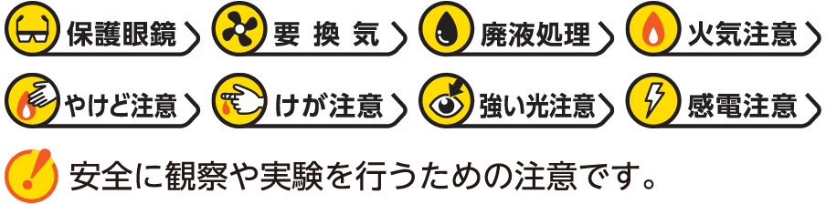 特別支援の観点から、実験の注意点を文字とアイコンで示しました。赤字で具体的な注意点も説明しています。