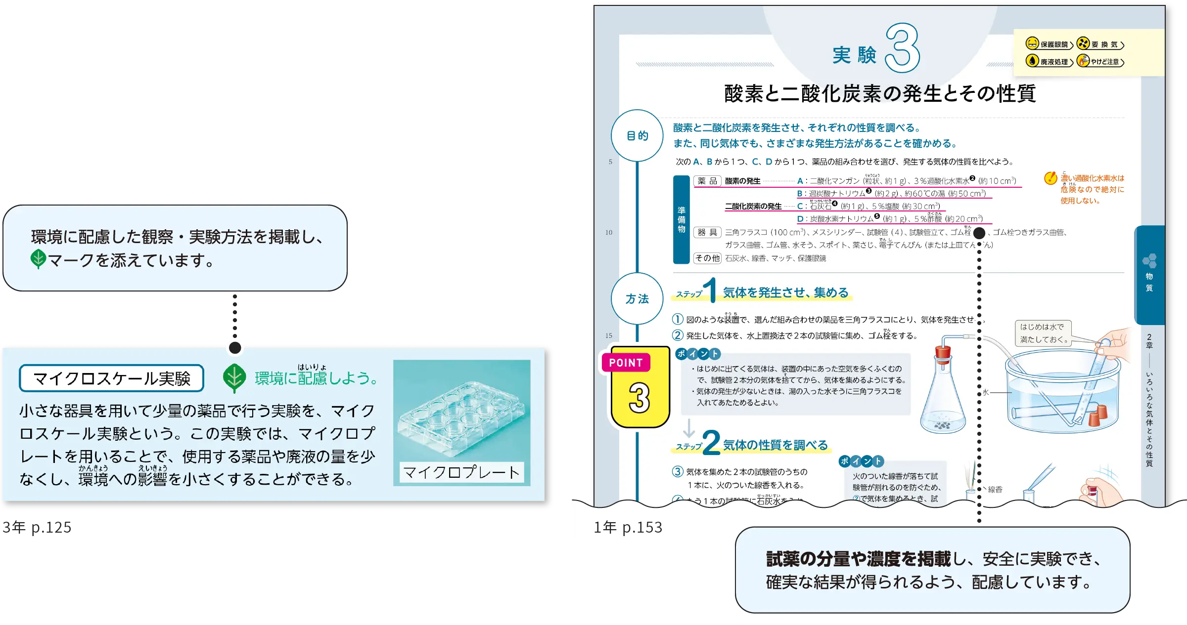 観察・実験では、安全面を最優先に、さらに確実に結果が得られる方法を長年追求してきました。教科書紙面の注意点を確認することで、安心して観察・実験が行え、学びが深まります。