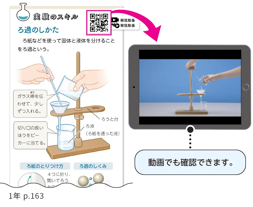 実験器具の使い方などを説明したコーナーです。「実験のスキル」のすべてにQR コンテンツがあり、動画などで操作方法を確認できます。