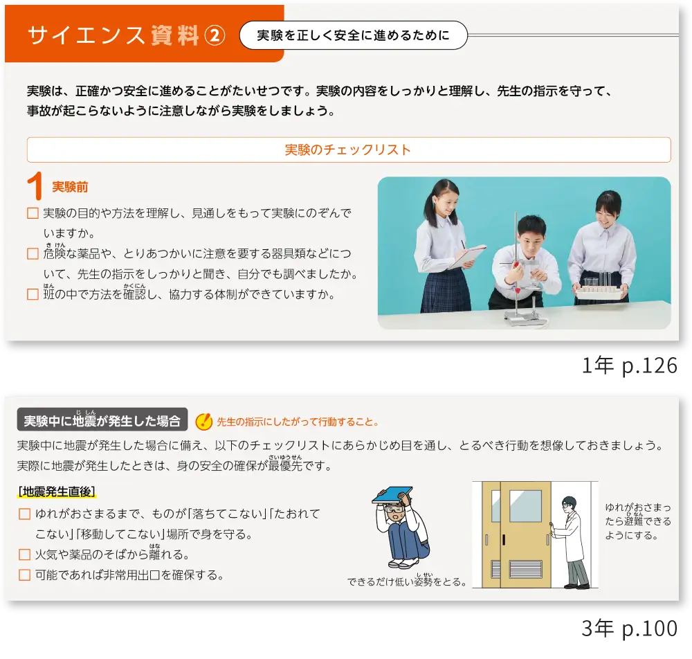 サイエンス資料「実験を正しく安全に進めるために」を各学年に掲載しています。実験中に地震が発生した場合の行動指針もあります。