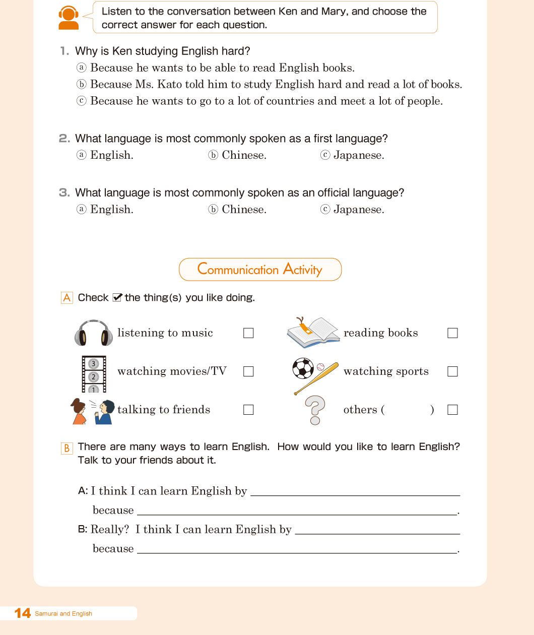 | Ken: | Yes. I asked my English teacher, Ms. Kato, how to study English. She told me to read many English books. |