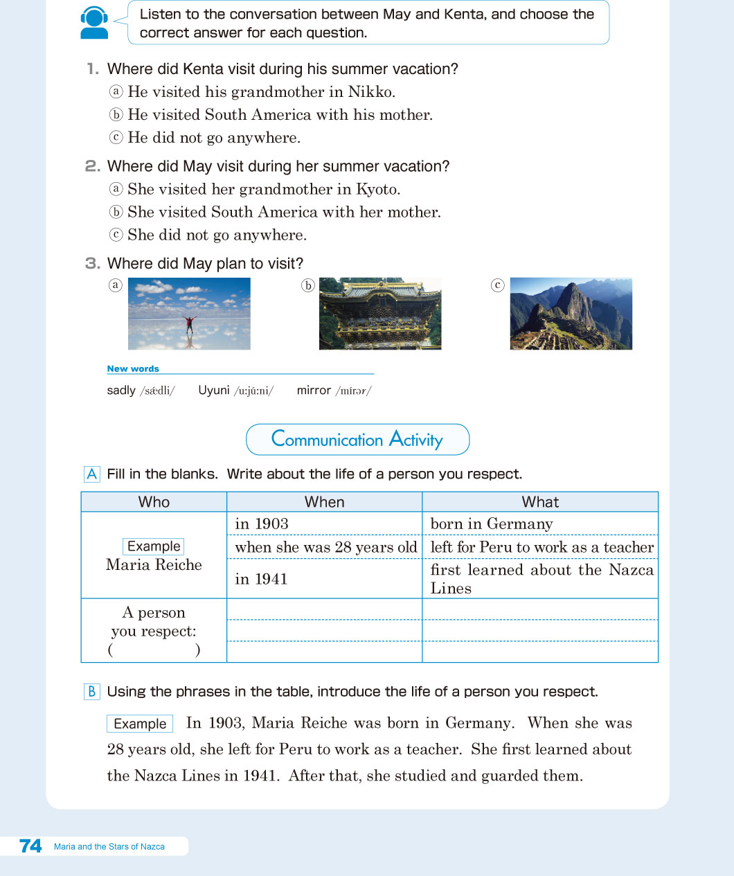 | Kenta: | Hi, May. I visited my grandmother in Nikko. I spent two weeks there. |