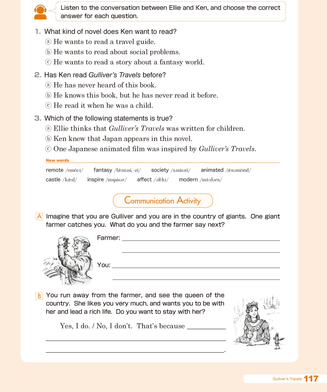 | Ellie: | I know a good one. Have you ever read Travels into Several Remote Nations of the World? It is also called Gulliver’s Travels. |