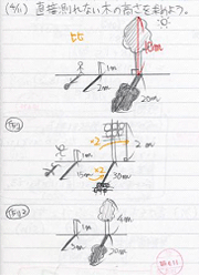 『この授業を取り組んで,自分としてはとても分かりやすかったです。まず、自分たちの手で、測角器を作り,そして,実際に使ってみて面白かったし,勉強にもなりました。また、ケイタイで家のそばの木を撮ったり,ごめんなはり線の駅を撮ったりして,自分たちの生まれ育ったところの良さを,改めて実感することができました。それともう一つ,問題を作る時,問題を解くのは分かっているのに,逆に問題を作る側になってみると,うまく数が合わなかったりして疲れました。