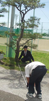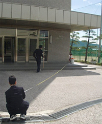 次に3人一組でお互いの目の高さを測った。以上で準備完了である。そして実測するため外に行くのだが,立ち位置によって“測りづらさ”を体感してもらうために,校舎から測定者の立ち位置の距離を2m,5m,10m,15m,20mと5箇所に設定した。