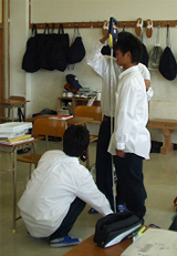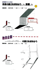 まず教室で,3人一班の班を作り,1m棒とメジャーと授業プリントを渡す。そして,この実験実習の統一テーマを校舎の高さを影を使って測ることとし,各班ごとにもう1つ好きなものの高さを測るという2本だてにすることを説明する。その後,生徒は班ごとに測量を開始する。