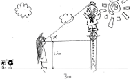 | ごめん,なはり線の人気のーつは,なんといっても大きく広がる太平洋をながめながら走ることです。最高のロケーションを持っている駅のひとつに赤野駅があります。その駅には太平洋を気持ちよく飛んでいるカモメをモチーフにした あかのカモメちゃん がたっています。 ここで問題です。 あかのカモメちゃん から3m離れたところから1番上を見上げると34°ありました。カモメちゃんの高さを求めなさい。ただし目の高さを1.5mとします。 |