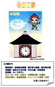 最後に,生徒の作った問題を冊子にしていく。その時に,“自分たちの住んでいる町”と“ごめんなはり線”との2つの内容が融合できるように,観光パンフレット的役割を持たせた。ごめんなはり線の各駅の案内版のページから,生徒の住んでいる町の自作問題の名所や史跡等まで導いていくというものである。「この駅から・・・に行ってみよう」といった様に書き加えた。こうすることによって,生徒たちが自分たちの住んでいる地域を知るということもできるし,単元を変えても,どんどん地域を掘り起こし,この問題集「ごめんなはり線で数学をしよう」に付け加えていけるのである。