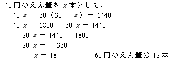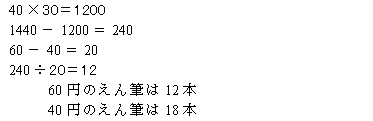 かず子さんは,1本40円と1本60円のえん筆をあわせて30本買って,1440円はらったそうです。