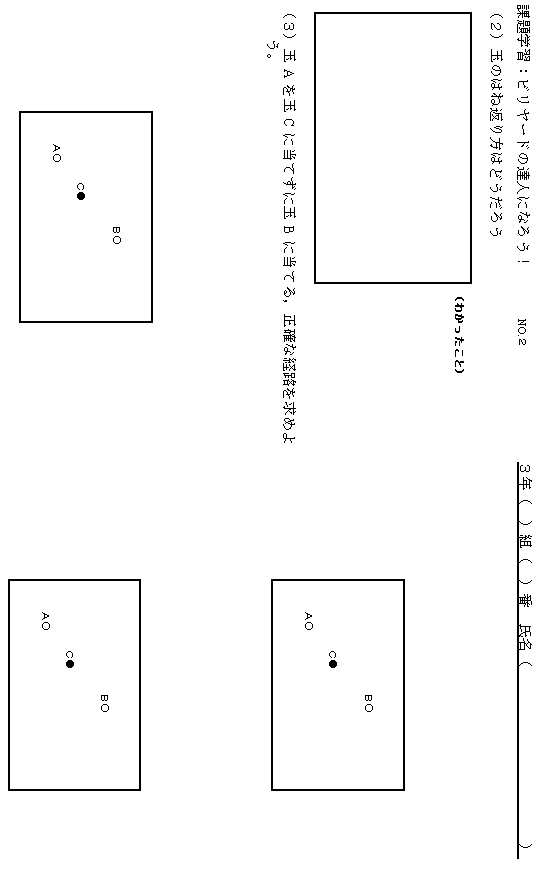 5.生徒の反応と指導の成果,課題 ビリヤードという身近な題材を使うことにより,反応もよく操作活動も楽しんで,学習できていた。日頃,「数学」に対して拒否反応を示しがちな生徒が,操作活動では一番に玉に当てみんなから拍手をもらい,喜んでいる姿も見られるなど,どの生徒においても操作活動を通して主体的な学習活動が期待でき,事象における数学の活用を学ぶことの楽しさや充実感を味わいながら学習を進めていくことができる課題であった。 ただし,一次関数を利用して求める方法については,「関数」,「傾き」,「切片」などと聞いただけで,拒否反応を示す生徒も少なくなく,復習の時間もとり,1時間では足りなかった。2年の一次関数終了後に行うほうが効率的だと思われる。 <参考文献>