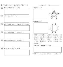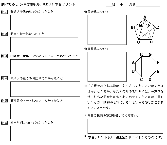 の6つです。 から まではその中から√2を見つけさせ, は√3を見つけさせます。「√2を見つけなさい」,「√3を見つけなさい」といっても,意味のわからない生徒もいるので,長さの比などの例を示しておきます。