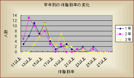 [考察] 学年が高くなるにつれ,体脂肪率は右の方にずれていっている。