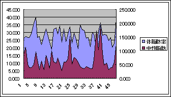 | [考察] | 同じ“脂肪”という言葉がついても,体脂肪率と,中性脂肪は,さしているものが違う。ただ,山の形が似ているところも所々に見られるので,すごく弱いながらも,相関関係があるともいえると思う。 |